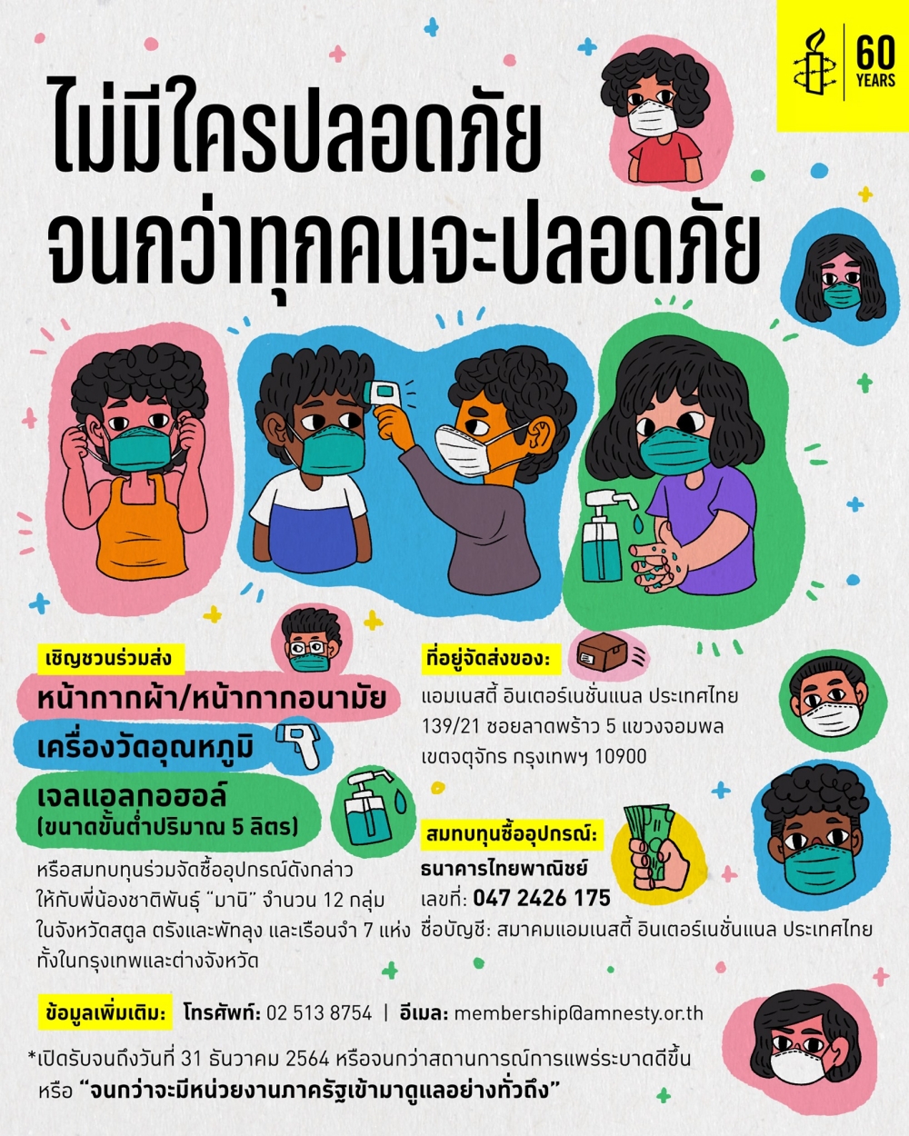 “ในระหว่างที่การจัดสรรวัคซีนยังไม่ทั่วถึง เราขอเชิญชวนร่วมแบ่งปันหน้ากากผ้า หน้ากากอนามัย เครื่องวัดอุณหภูมิ และเจลแอลกอฮอล์ หรือสมทบทุนร่วมจัดซื้ออุปกรณ์ดังกล่าวให้กับพี่น้องกลุ่มชาติพันธุ์ “มานิ” จำนวน 12 กลุ่ม กว่า 500 คนในจังหวัดสตูล ตรังและพัทลุง และเรือนจำ 7 แห่งทั้งในกรุงเทพและต่างจังหวัด ได้แก่ เรือนจำกลางจังหวัดเชียงใหม่ เรือนจำกลางจังหวัดกาฬสินธุ์ ทัณฑสถานหญิงกลาง กรุงเทพมหานคร . เรือนจำพิเศษกรุงเทพมหานคร ทัณฑสถานหญิงธนบุรี เรือนจำจังหวัดธัญบุรี เรือนจำกลางจังหวัดนราธิวาส”