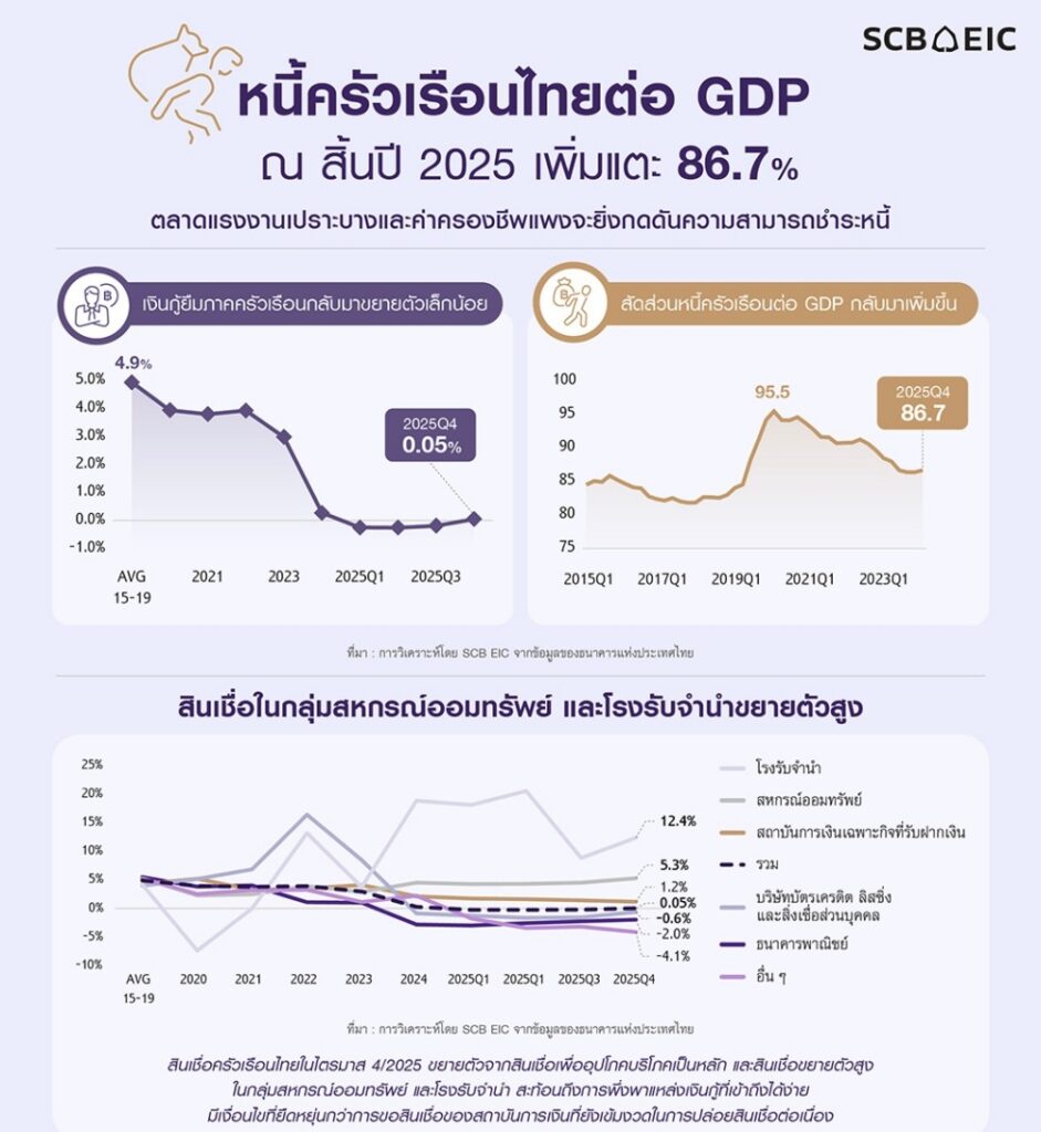 หนี้ครัวเรือนไทยในไตรมาส 4/2025 กลับมาขยายตัวเล็กน้อย 0.05%YOY หลังจากหดตัวติดต่อกัน 3 ไตรมาส ทำให้สัดส่วนหนี้ครัวเรือนต่อ GDP ณ สิ้นปี 2025 เพิ่มเป็น 86.7% จากการขยายตัวของหนี้เพื่อการอุปโภคบริโภคส่วนบุคคลเป็นหลัก ขณะที่สินเชื่อเพื่อการลงทุนและสินเชื่อเพื่อประกอบธุรกิจยังคงหดตัว