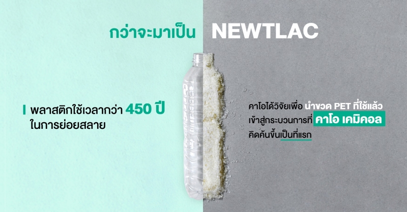 นวัตกรรม NEWTLAC จากคาโอ ได้พิสูจน์ให้เห็นถึงคุณค่าของ “ขยะพลาสติก PET” โดยใช้ความรู้ด้านนวัตกรรมที่มี เพื่อนำมาช่วยเหลือยกระดับสังคมไทย พัฒนาวัสดุเหลือใช้ให้กลายเป็นส่วนผสมสำคัญของ “สินทรัพย์ของโครงสร้างพื้นฐานด้านคมนาคม” กลายเป็นเคมีภัณฑ์ที่ใช้ปรับปรุงคุณภาพยางมะตอย ซึ่งถูกคิดค้นขึ้นเป็นครั้งแรกโดยคาโอ เคมิคอล