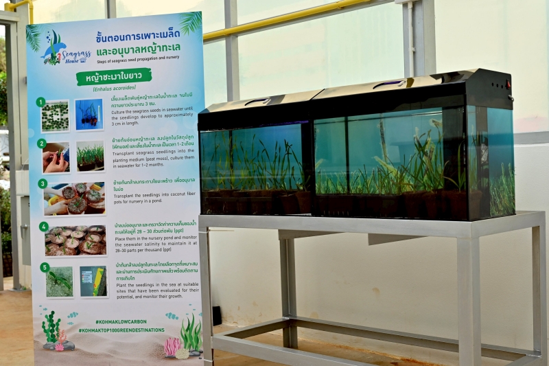 กลอยตา ณ ถลาง รองกรรมการผู้จัดการใหญ่ สายงานบริหารความยั่งยืนและสื่อสารองค์กร บริษัท บางจาก คอร์ปอเรชั่น จำกัด (มหาชน) ขยายความต่อเนื่อง ตัวเลขเพียงประโยคนี้คือแรงบันดาลใจให้บางจากฯ เริ่มต้นโครงการ “หญ้าทะเลสู้โลกร้อน” บนเกาะหมาก ร่วมกับ คณะประมง มหาวิทยาลัยเกษตรศาสตร์, องค์การบริหารพื้นที่พิเศษเพื่อการท่องเที่ยวอย่างยั่งยืน (อพท.), และ องค์การบริหารส่วนตำบลเกาะหมาก เพื่อศึกษาศักยภาพของหญ้าทะเลในฐานะ Blue Carbon Ecosystem ที่กักเก็บคาร์บอนได้นานกว่าป่าบกหลายเท่า