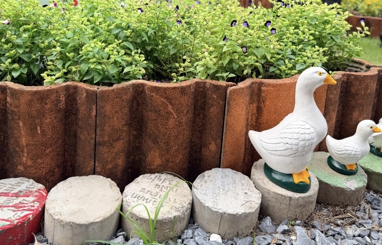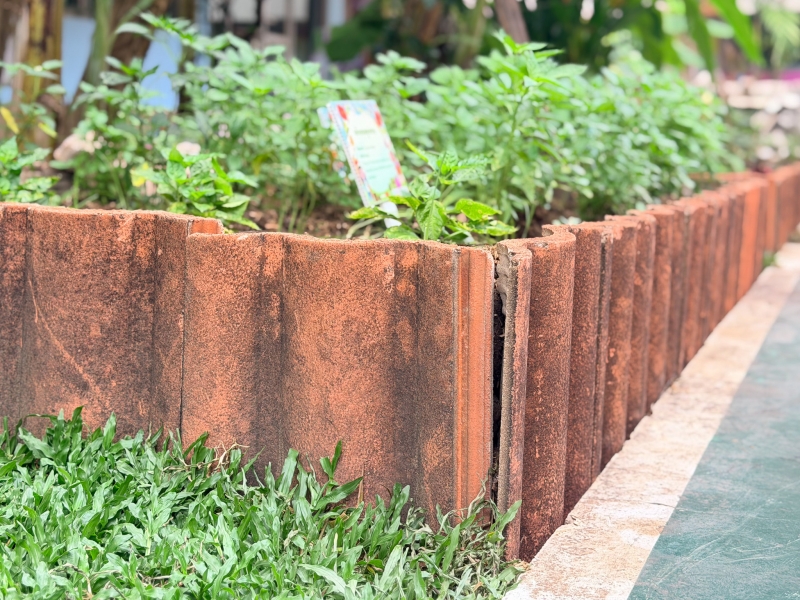 ใช้กระเบื้องเก่าและวัสดุเหลือใช้มาประยุกต์เป็นโครงสร้างสวนและแปลงปลูก แสดงให้เห็นว่า “สิ่งที่คิดว่าหมดค่าแล้ว ยังสร้างประโยชน์ได้” ในเชิงรูปธรรม