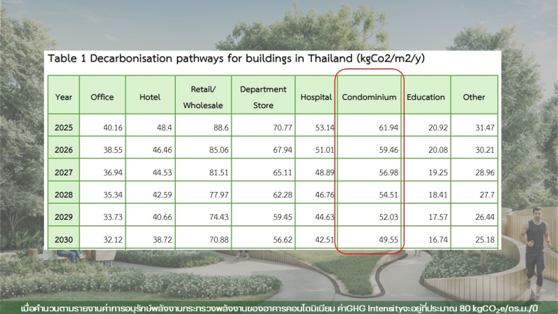 ภายใต้ Thailand Taxonomy เฟส 2 ภาคอาคารต้องลดการปล่อยก๊าซเรือนกระจกอย่างต่อเนื่อง โดยเส้นทาง Decarbonisation ของอาคารคอนโดมิเนียมกำหนดให้ค่า GHG Intensity ลดลงจากประมาณ 61.94 kgCO₂/m²/ปี ในปี 2025 สู่ 49.55 kgCO₂/m²/ปี ในปี 2030 ขณะที่อาคารทั่วไปยังอยู่ราว 80 kgCO₂/m²/ปี แสดงให้เห็นว่าโครงการที่ผ่านเกณฑ์ต้องลดคาร์บอนอย่างมีนัยสำคัญและต่อเนื่องจนถึงเป้าหมาย Net Zero ในระยะยาว ซึ่งการลดคาร์บอนนี้ไม่ได้เกิดจากเทคโนโลยีเพียงอย่างเดียว แต่เกิดจากการออกแบบที่ผสานธรรมชาติเข้ากับโครงสร้างอาคารตั้งแต่ต้น