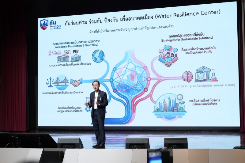 การที่จุฬาลงกรณ์มหาวิทยาลัยจัดตั้งศูนย์ “กันก่อนท่วม” ใช้องค์ความรู้แบบสหสาขาและเครือข่ายความร่วมมือทั้งรัฐ เอกชน ชุมชน และต่างประเทศ เพื่อเป็นกลไกกลางเชื่อมงานวิจัยสู่การลงมือทำจริง ตั้งแต่การสื่อสารความเสี่ยงให้ประชาชนเข้าใจง่าย ไปจนถึงการเสนอกรอบแผนบริหารจัดการน้ำแบบบูรณาการต่อผู้กำหนดนโยบาย ครอบคลุมระยะสั้น–กลาง–ยาว โดยเน้น “ทลายกำแพงการทำงานแบบแยกส่วน” และผลักให้รัฐปรับโครงสร้างการทำงานด้านน้ำสู่การบูรณาการเชิงระบบ เช่น ใช้ข้อมูลชุดเดียวกันทั้งประเทศ วางแผนบนฐานลุ่มน้ำไม่ใช่เส้นแบ่งจังหวัด และเชื่อมงบประมาณ นโยบาย และความรับผิดชอบให้เป็นระบบเดียว เพื่อให้การป้องกันภัยน้ำเกิดผลจริง ไม่จบแค่เวทีเสวนาหรือรายงานเชิงวิชาการ