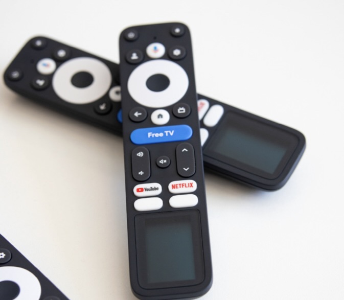 G32 ยังคงแบบเดิมของ Google TV มีปุ่ม D-pad ทรงกลมขนาดใหญ่อยู่ด้านบน มีปุ่ม Home และ Back ปุ่มเฉพาะสำหรับ YouTube และ Netflix และปุ่ม “Free TV” สีฟ้าสดใสอยู่ตรงกลาง ในภาพดูเหมือนตัวควบคุม Google TV ทั่วไปที่บังเอิญมีหน้าจอเสริมอยู่ด้านล่าง จริงๆ แล้วเป็นพื้นที่เก็บแสง