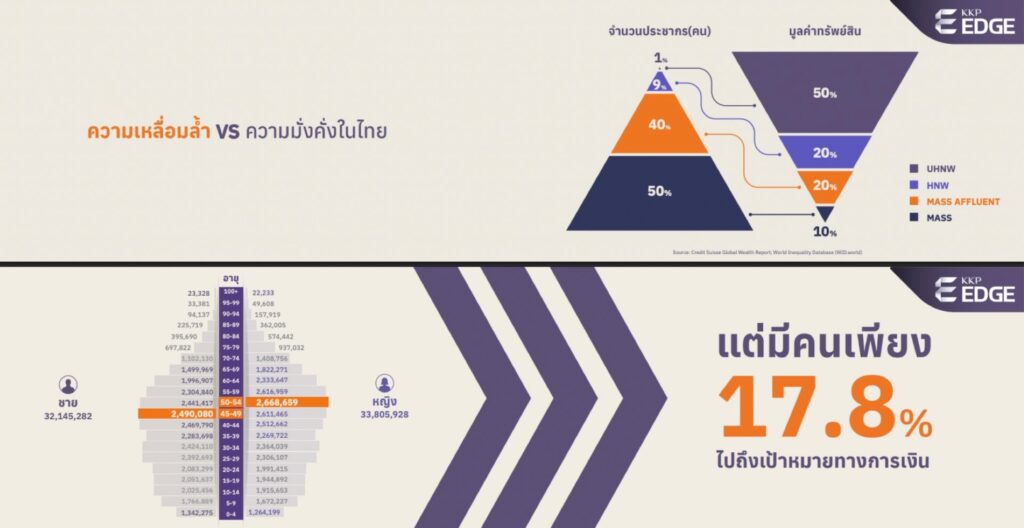 สังคมไทยกำลังเข้าสู่ยุค Longevity ที่คนมีโอกาสอายุยืนถึง 90-100 ปี แต่ที่น่ากังวลคือคนไทยส่วนใหญ่ “ไม่มีแผนชีวิต” มาตั้งแต่ต้น โดยสถิติระบุว่ามีเพียง 17.8% เท่านั้นที่บรรลุเป้าหมายทางการเงิน ขณะที่เกือบครึ่งหนึ่งแม้จะเริ่มวางแผนแล้วแต่กลับหลุดออกจากเส้นทางระหว่างทาง โดยเฉพาะกลุ่ม Mass Affluent หรือ “กลุ่มเดอะแบก” ซึ่งเป็นคนรายได้ดีที่แบกรับภาระรอบด้านทั้งลูก หรือพ่อแม่ และความกังวลว่าเงินที่มีจะพอใช้สำหรับทุกวัตถุประสงค์หรือไม่