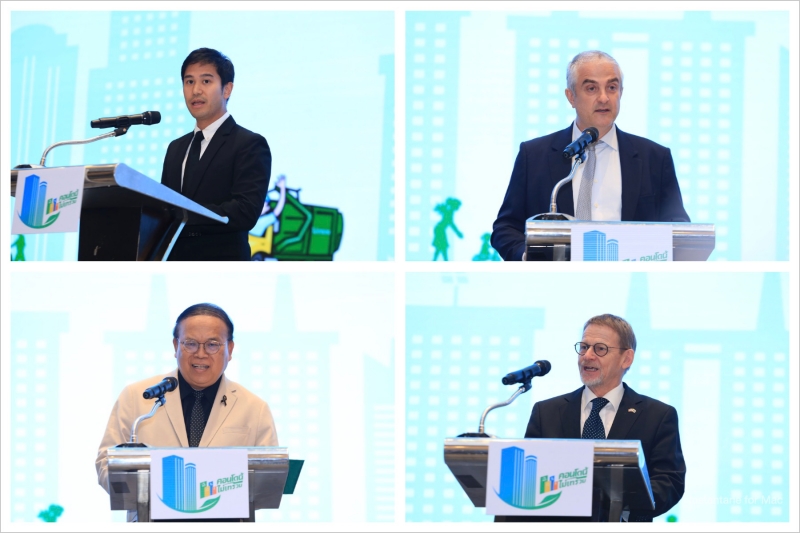 พรพรหม วิกิตเศรษฐ์ ที่ปรึกษาของผู้ว่าราชการกรุงเทพมหานครและผู้บริหารด้านความยั่งยืนกรุงเทพมหานคร ดร.วิจารย์ สิมาฉายา ผู้อำนวยการสถาบันสิ่งแวดล้อมไทย H.E. Mr. Danny Annan, Ambassador of Denmark to Thailand และ Jens Nytoft Rasmussen, Programme Manager, The Danish Environmental Protection Agency (DEPA) ร่วมกันกล่าวถึงความร่วมมือการยกระดับสู่“คอนโดนี้…ไม่เทรวม”